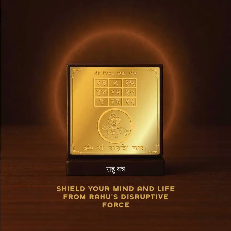 The Rahu Yantra helps neutralize the malefic effects of planet Rahu, which often causes confusion, delays, sudden losses, or mental unrest. Energized through Vedic rituals, this yantra channels Rahu's energy positively to grant clarity, confidence, and protection from hidden enemies and black magic.